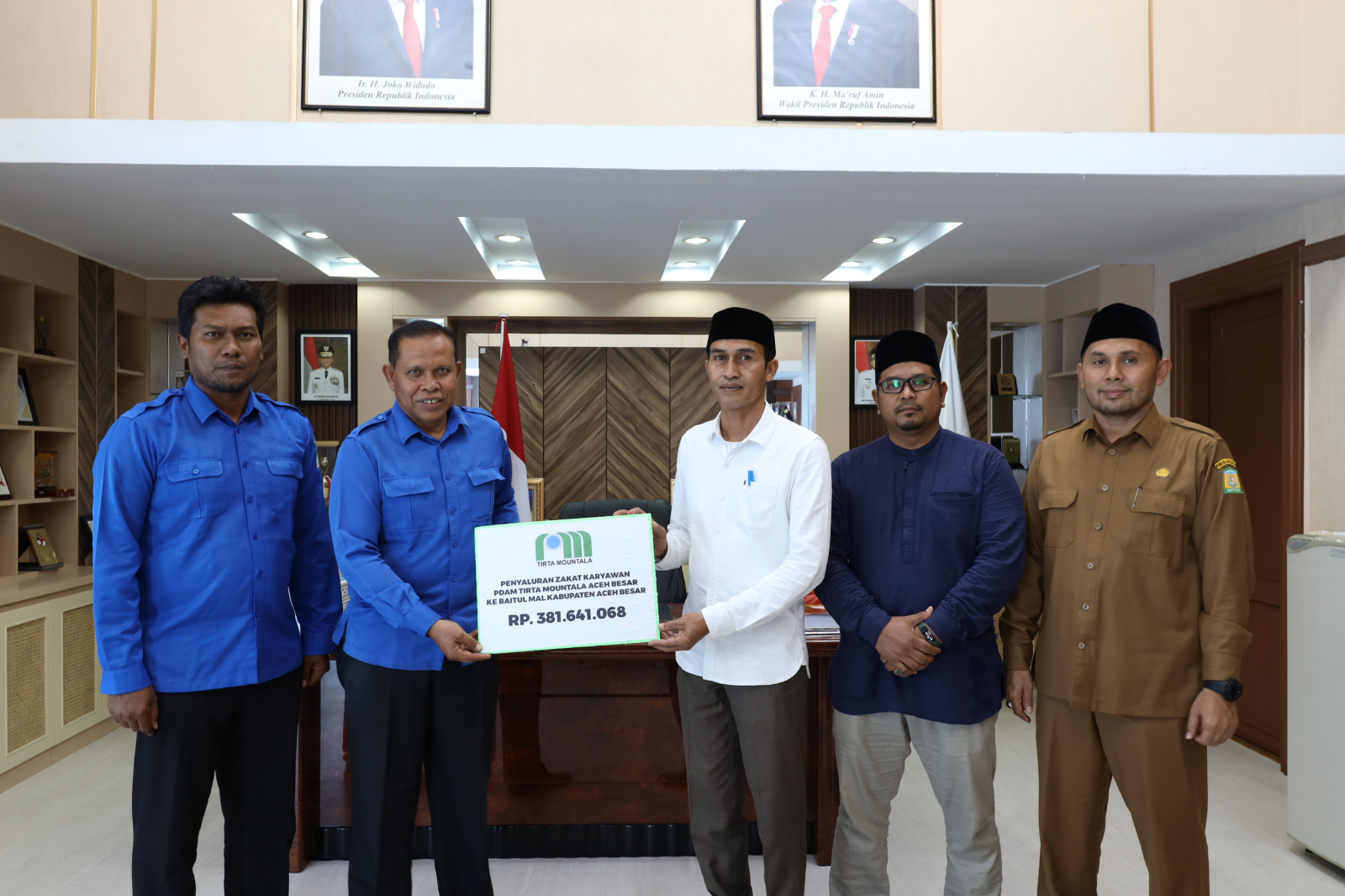Jantho. Forumrakyat.co.id – Direktur Utama Perumda Tirta Mountala Kabupaten Aceh Besar Ir Sulaiman didampingi Direktur Umum, David Zainal SE, Senin (09/10/2023) siang, menyerahkan zakat yang dihimpun dari karyawan (ti) PDAM Tirta Mountala kepada Ketua Baitul Mal Aceh Besar Tgk H Azwir SE, dengan nilai Rp 381.641.068. Penyerahan itu berlangsung di ruang kerja Bupati Aceh Besar, di Kota Jantho.