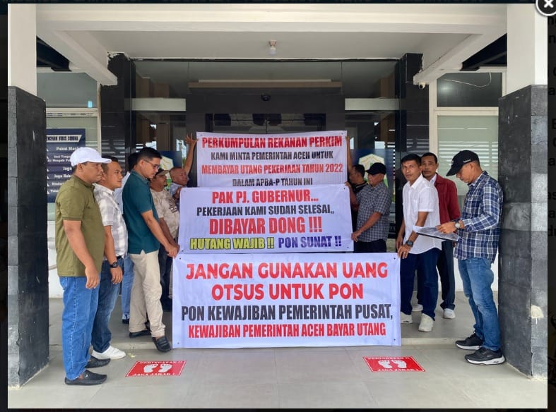 Mereka menuntut Pemerintah Aceh membayar hutang proyek yang telah selesai dikerjakan dari anggaran tahun 2022 sebesar Rp 69.976.611.346,75.
