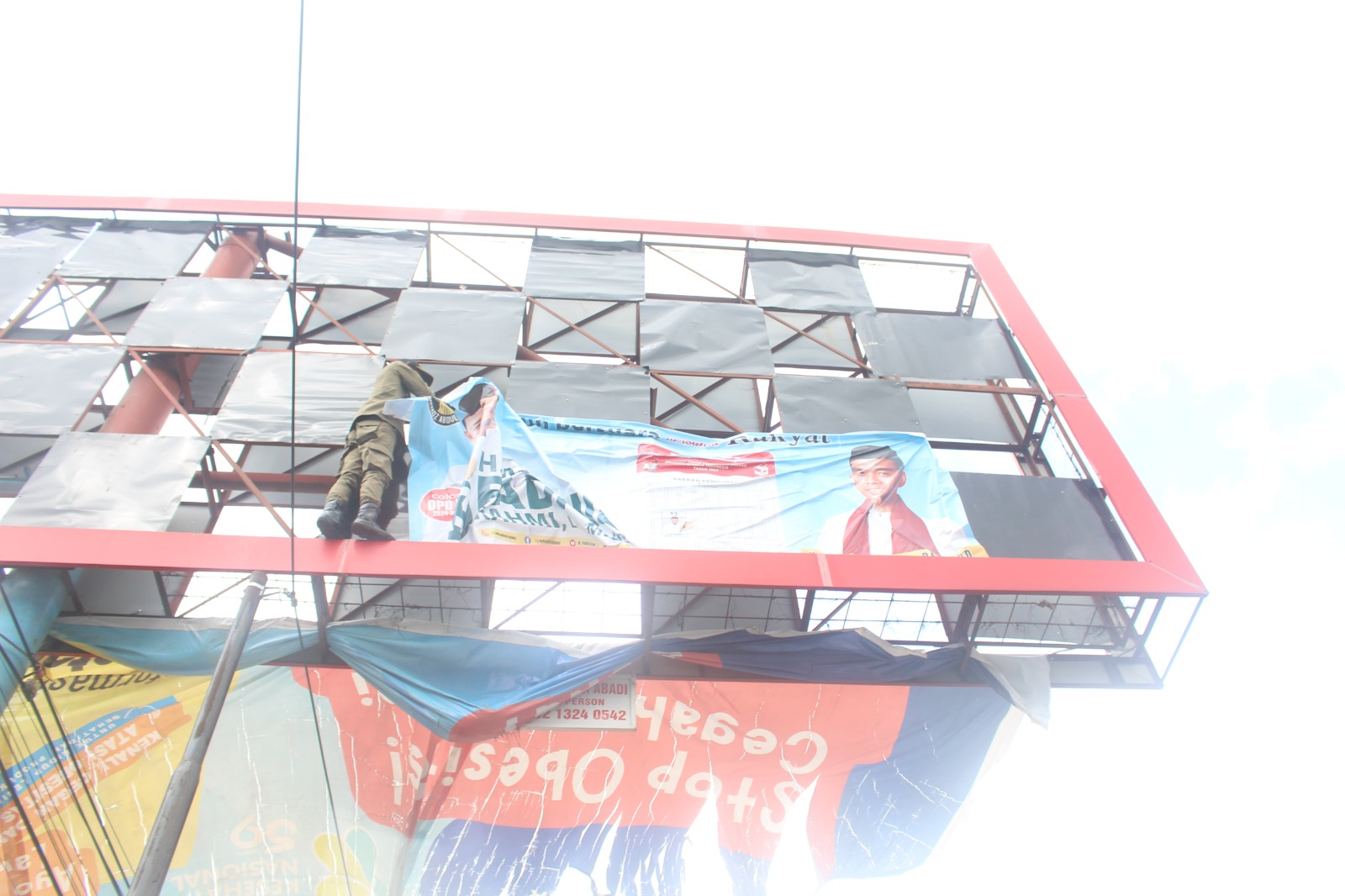 Petugas menurunkan dan membongkar satu persatu APK para caleg maupun paslon Capres-Cawapres. Mulai dari banner, baliho, hingga spanduk dengan berbagai ukuran.