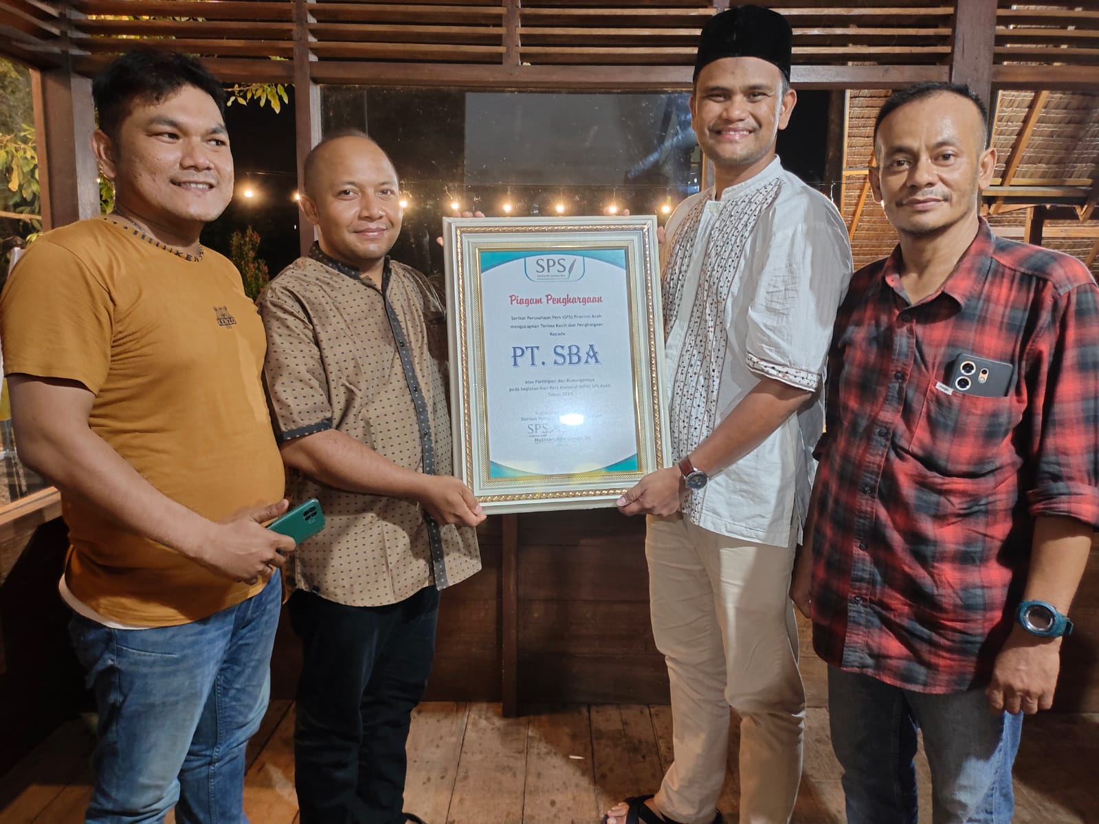 Jantho, FR – Serikat Perusahaan Pers (SPS) Perwakilan Aceh, yang diwakili Ketua Panitia HPN 2024, Sadali menyerahkan plakat kepada PT Solusi Bangun Andalan (SBA) yang diterima Head of Media PT SBA, Faraby Azwany. Penyerahan dilaksanakan saat silaturahmi dan buka puasa bersama Pers Siber Indonesia (PSI) Aceh, di Rumah Makan Paga Ayee, Lambaro, Kabupaten Aceh Besar, Kamis, 4 Maret 2024.