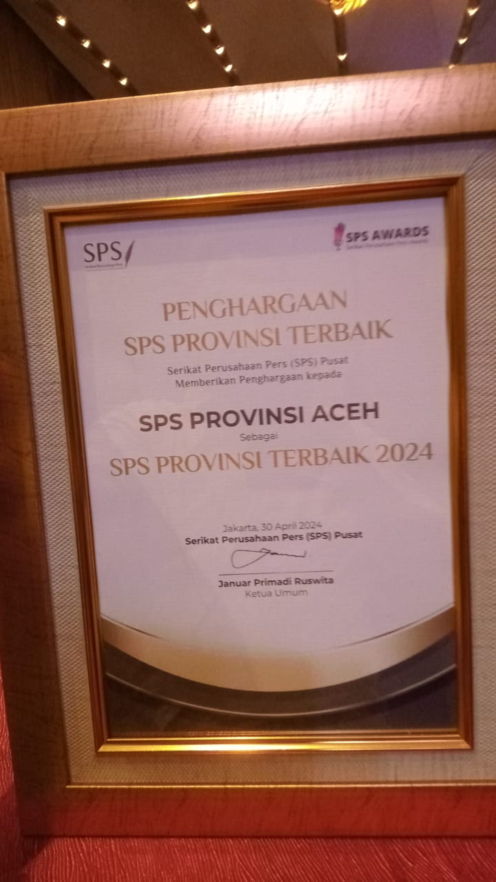 JAKARTA, FR – Serikat Perusahaan Pers (SPS) Provinsi Aceh dinobatkan sebagai SPS Provinsi terbaik tahun 2024. Penghargaan bergengsi tersebut diberikan Serikat Perusahaan Pers (SPS) Pusat dalam ajang kompetisi SPS Awards 2024 dengan mengusung tema besar “Pers Sehat, Demokrasi Kuat” pada Selasa, 30 April 2024, di Hotel Ciputra, Jakarta.
