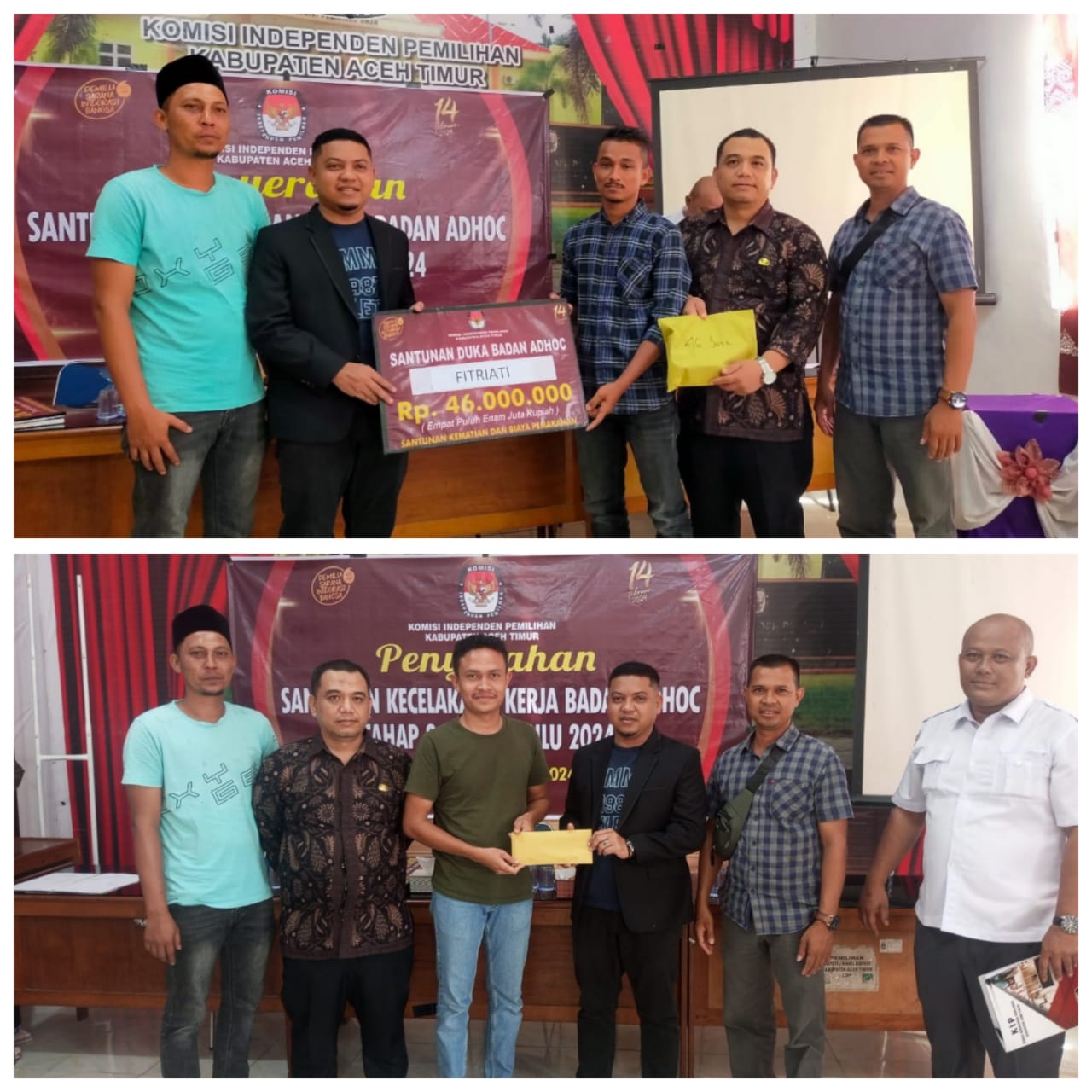 Bantuan tersebut kita serahkan secara Tunai kepada Muhammad Iqbal yaitu suami dari Alm. Fitriati dengan total Rp. 46.000.000 dan yang kedua kepada Maulana Sofansyah Rp. 2.000.000 sebagai anggota PPK Kecamatan Nurussalam yang mengalami sakit pada saat menjalankan tugasnya sebagai penyelenggara Pemilu.