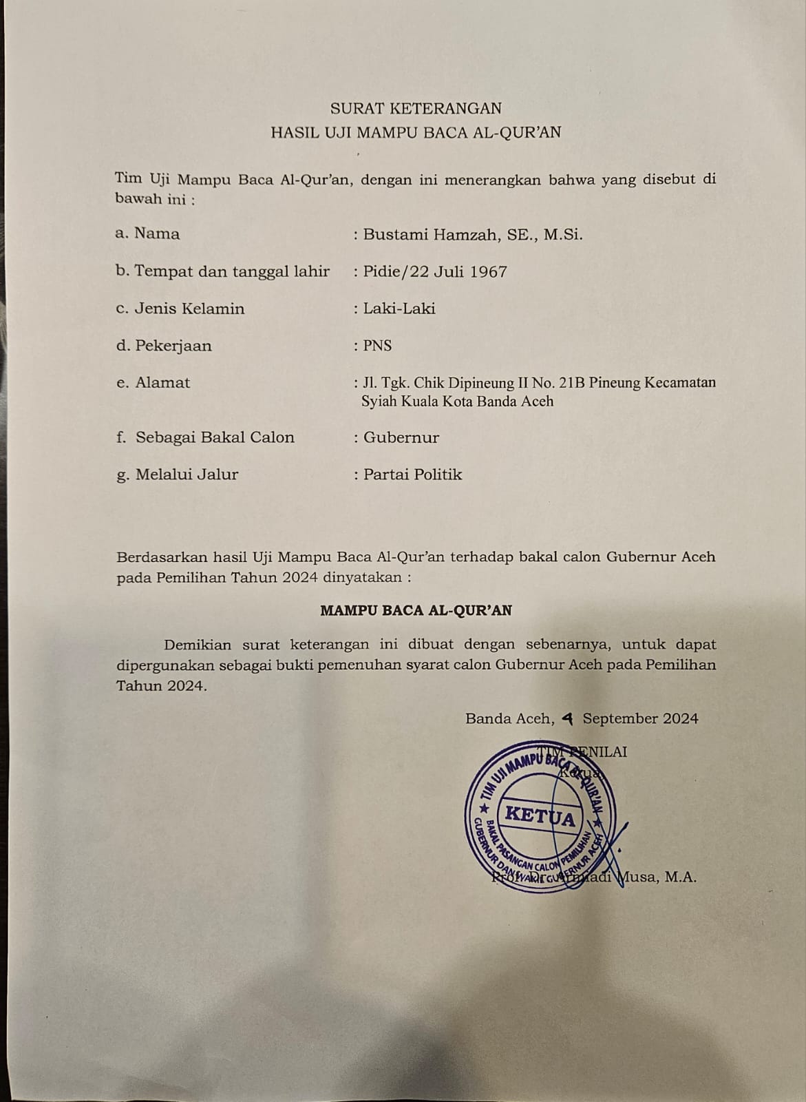“Kita semua sudah melihat para kandidat membaca Al-Qur’an dan Alhamdulillah Bustami Hamzah lulus uji mampu baca Al-Qur’an”. Ungkap Yusri kepada wartawan.