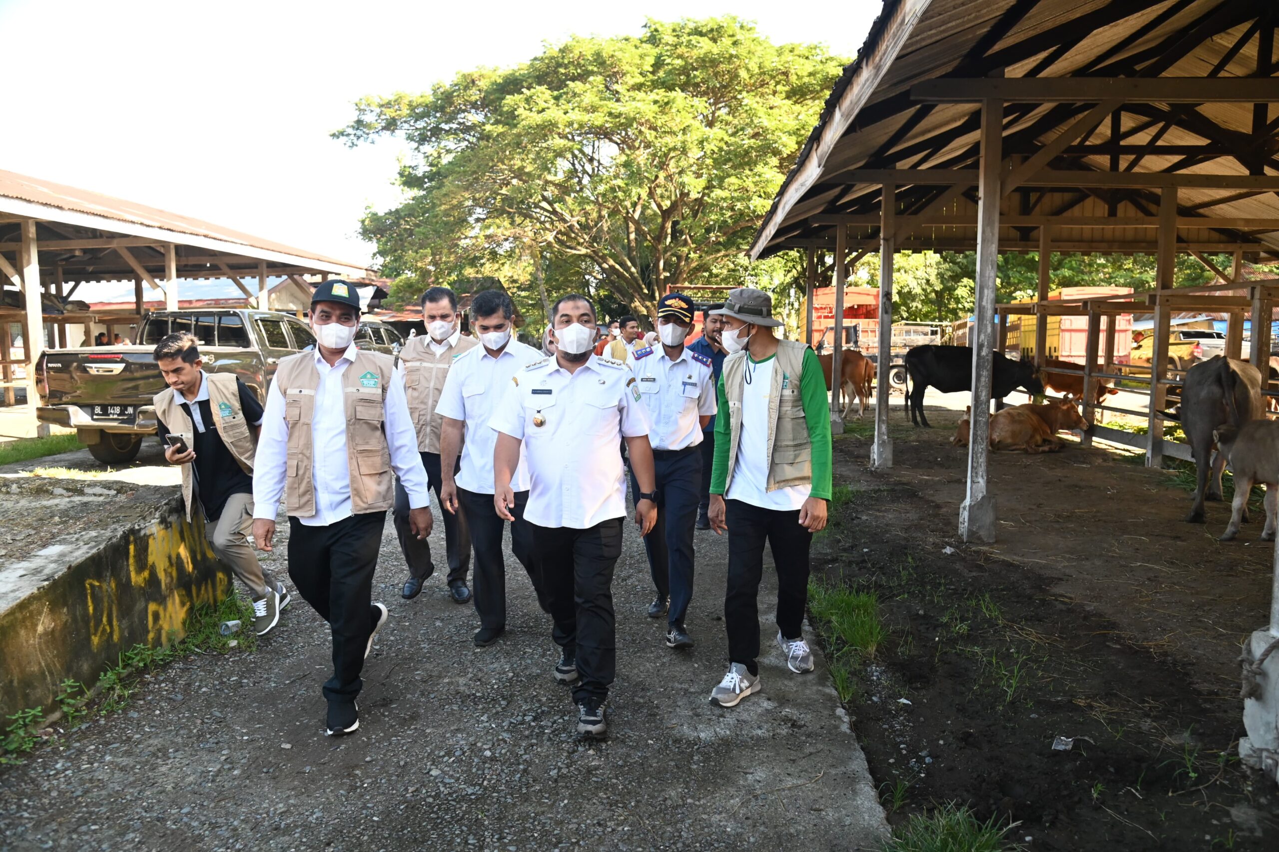 Penjabat (Pj) Bupati Aceh Besar Muhammad Iswanto, S.STP MM didampingi Kepala Dinas Pertanian Jakfar SP MSi, Plt Kepala Dinas Koperasi UKM dan Perdagangan Trizna Darma ST, Plt Kepala Dinas Perhubungan Dodi Trisna SSTP MSi serta Camat Sukamakmur Azhari SH MSi, memantau langsung proses penyemprotan desinfektan yang dilakukan oleh Gugus Tugas Penanganan PMK, terhadap setiap ternak yang masuk ke pasar hewan tersebut.