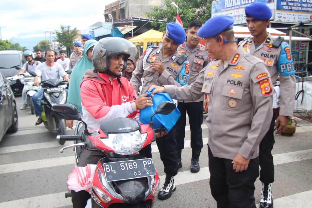 Banda Aceh, Fr – Dirpolairud Polda Aceh Kombes Wahyu Prihatmaka menggelar aksi sosial dengan turun langsung membagikan takjil kepada para pengendara yang melintas di depan Masjid Al-Abrar, Lamdingin, Kota Banda Aceh, Jumat, 14 Maret 2025.
