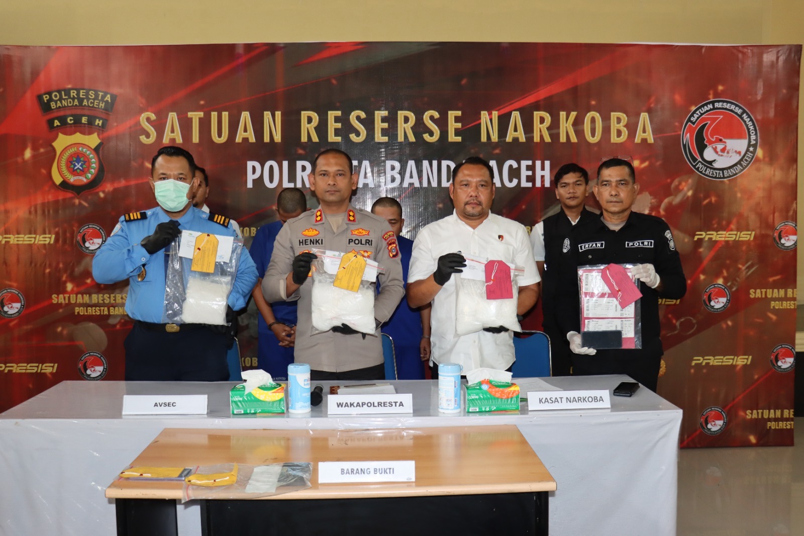Banda Aceh, Fr – Personel Satresnarkoba Polresta Banda Aceh bersama petugas Avsec Bandara Internasional Sultan Iskandar Muda (SIM) Aceh Besar lagi-lagi menggagalkan penyelundupan narkotika.