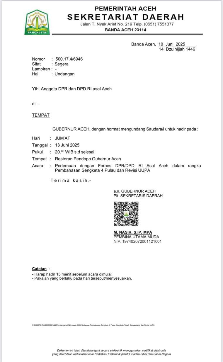 Informasi ini diketahui dari sebuah undangan resmi atas nama Gubernur Aceh yang beredar di sejumlah grup WhatsApp. Dalam dokumen bertanggal 10 Juni 2025 dan bernomor 500.17.4/6946 itu, pertemuan disebut sebagai ajang konsolidasi antara Pemerintah Aceh dan Forbes (Forum Bersama) DPR/DPD RI asal Aceh, untuk menyikapi perkembangan terkini yang menyangkut kedaulatan wilayah serta keberlanjutan kekhususan Aceh dalam sistem ketatanegaraan Indonesia.