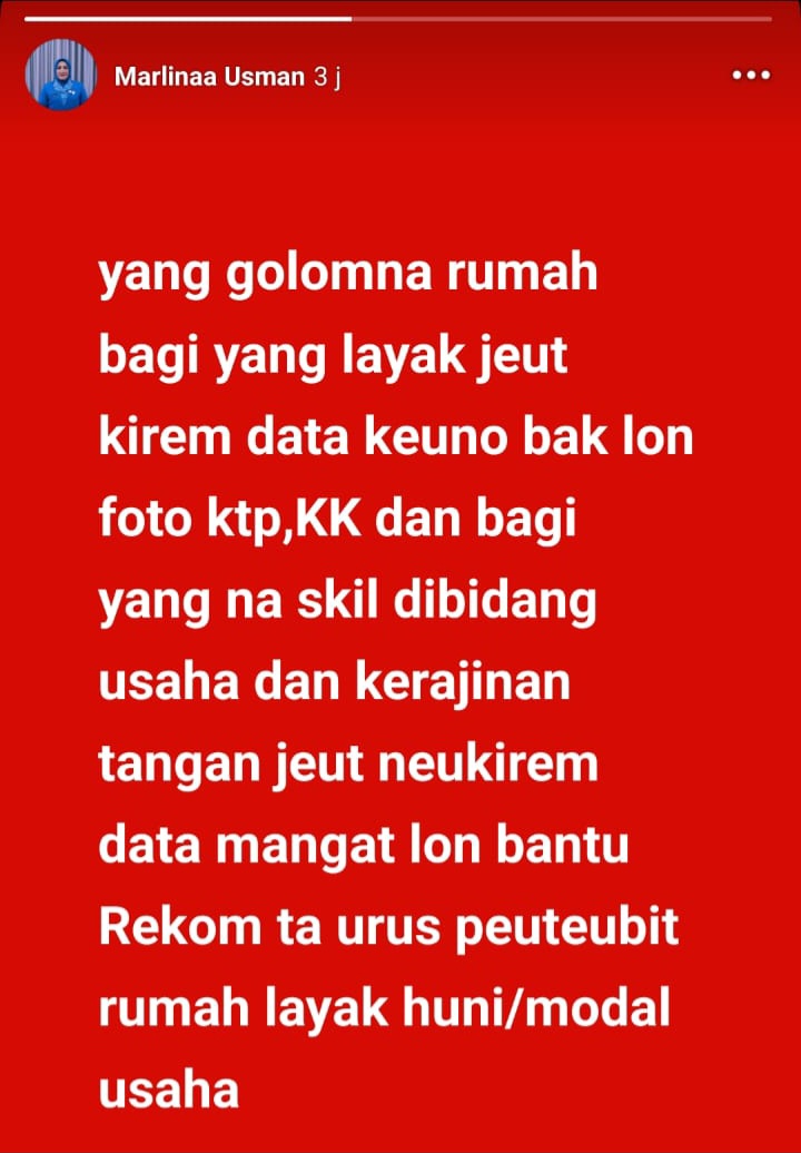 Dalam unggahan tersebut, akun palsu itu meminta agar warga yang merasa layak menerima bantuan mengirimkan data melalui pesan langsung. Narasi yang digunakan seolah-olah berasal dari Marlina Usman secara pribadi, bahkan ditulis menggunakan bahasa Aceh.