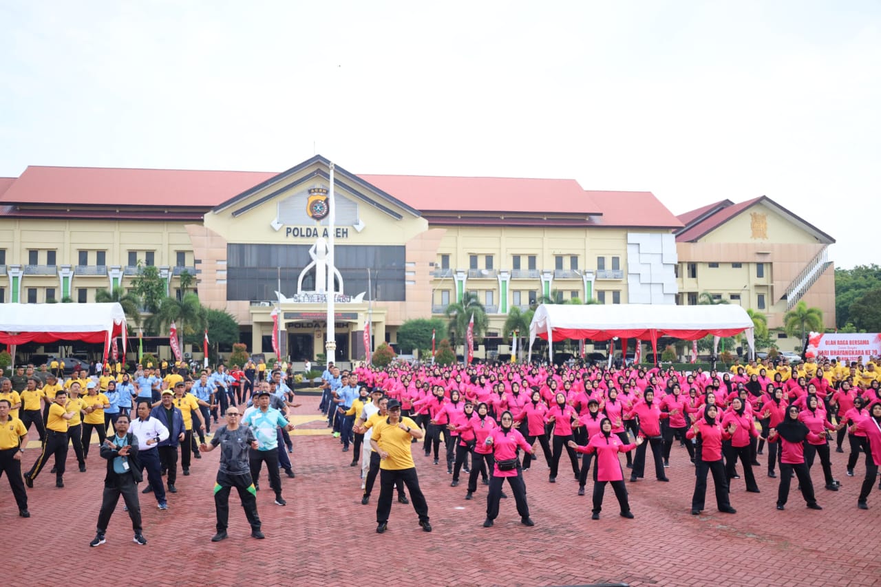 Banda Aceh, FR — Dalam rangka memeriahkan Hari Bhayangkara ke-79, Polda Aceh menggelar olahraga bersama di lapangan Polda Aceh, Rabu, 25 Juni 2025. Olahraga bersama itu diikuti oleh TNI-Polri, Pengurus Bhayangkari, kejaksaan, Dishub, Jasa Raharja, unsur Forkopimda, dan lembaga lainnya.