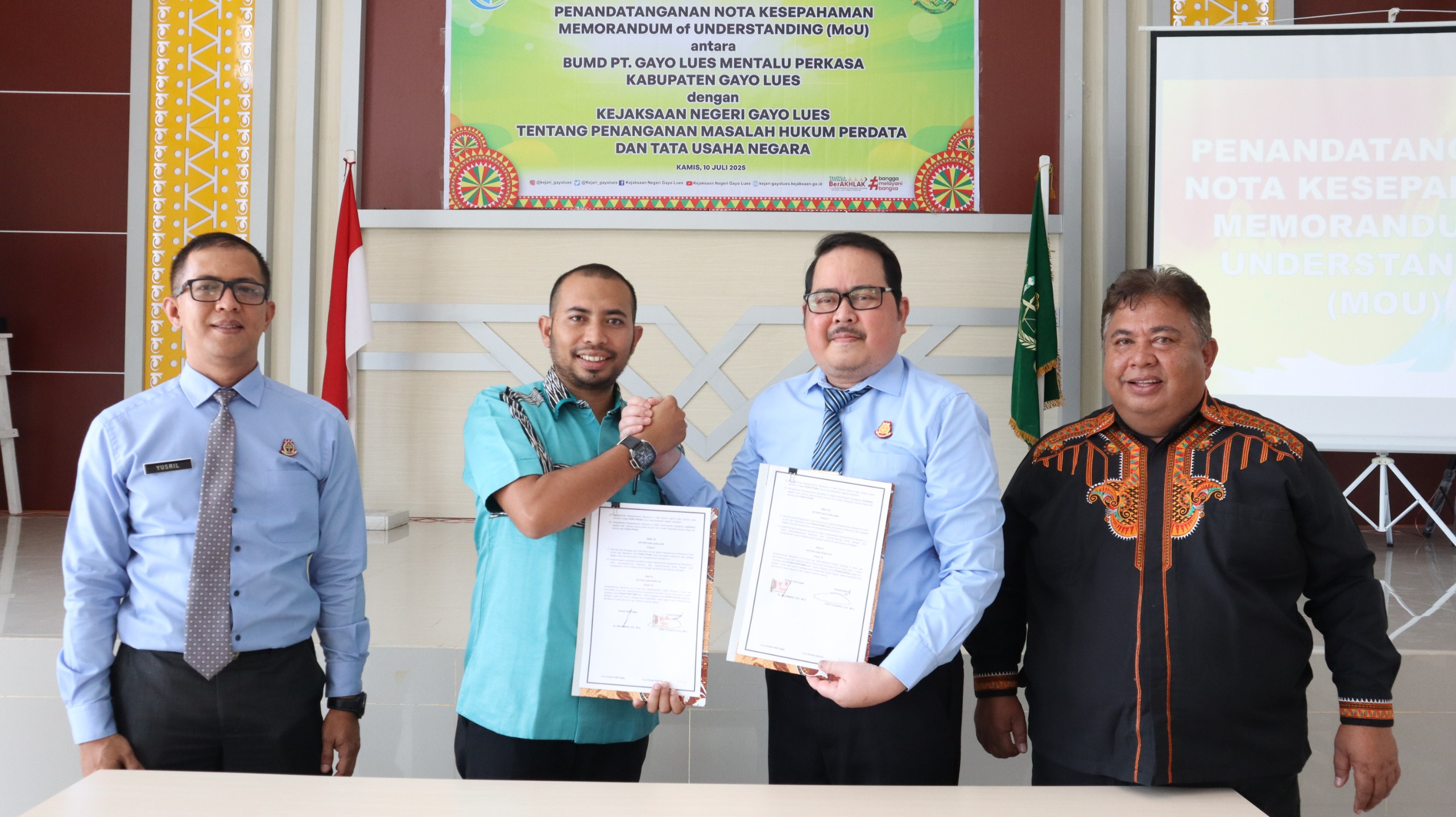 forumrakyat.co.id |Gayo Lues -Badan Usaha Milik Daerah (BUMD) PT. Gayo Lues Mentalu Perkasa bersama Kejaksaan Negeri Gayo Lues melakukan penandatanganan Memorandum of Understanding (MoU) tentang Penanganan Masalah Hukum Perdata dan Tata Usaha Negara, di Aula Kantor Kejaksaan Negeri Gayo Lues, Kamis (10/7/2025).