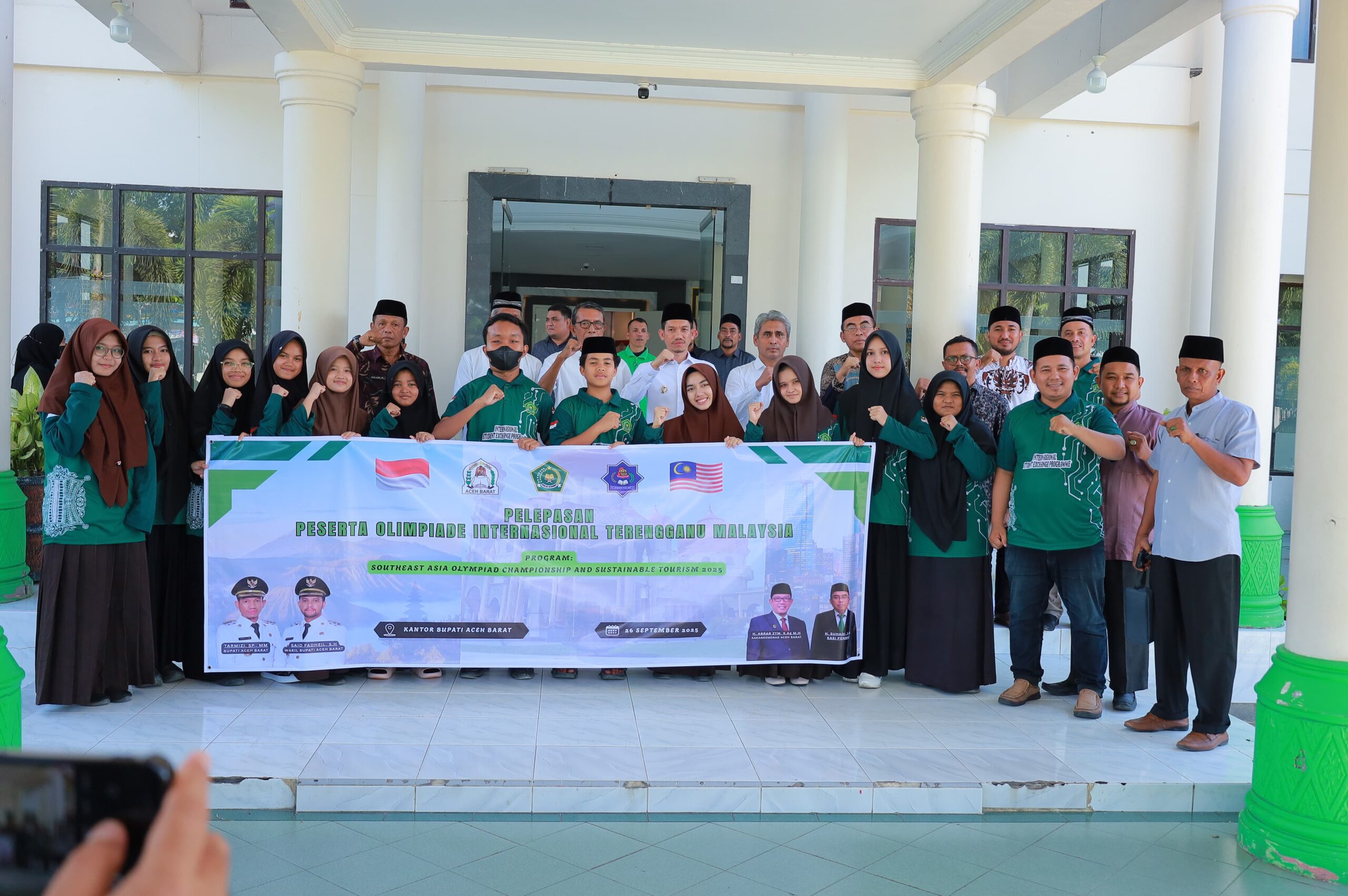Forumrakyat.co.id | Meulaboh– Bupati Aceh Barat, Tarmizi SP, MM secara resmi melepas 12 siswa berprestasi dari jajaran Kantor Kementerian Agama Kabupaten Aceh Barat, jumat (26-9-2025) dihalaman kantor bupati untuk mengikuti ajang bergengsi “Southeast Asia Olympiade Championship and Sustainable Tourism Workshop 2025” di Terengganu, Malaysia. Kegiatan ini akan berlangsung sejak 29 September hingga 2 Oktober 2025.