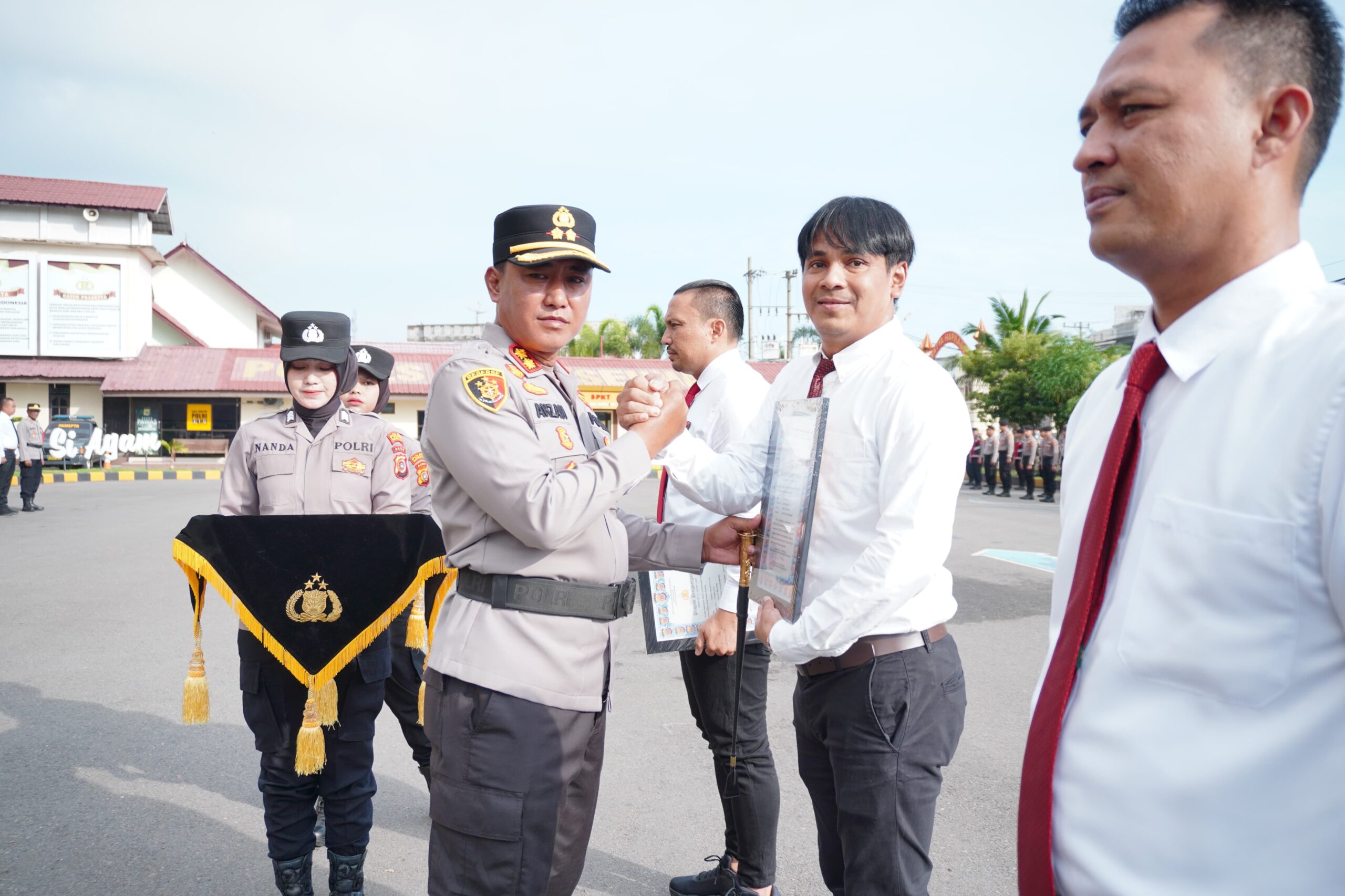 Lhokseumawe, FR – Kapolres Lhokseumawe AKBP Dr. Ahzan, S.H., S.I.K., M.S.M., M.H memimpin langsung upacara pemberian penghargaan kepada personel Sat Reskrim dan Sat Narkoba Polres Lhokseumawe yang berprestasi, berlangsung di halaman Satya Haprabu Polres Lhokseumawe, Senin pagi (3/11/2025).