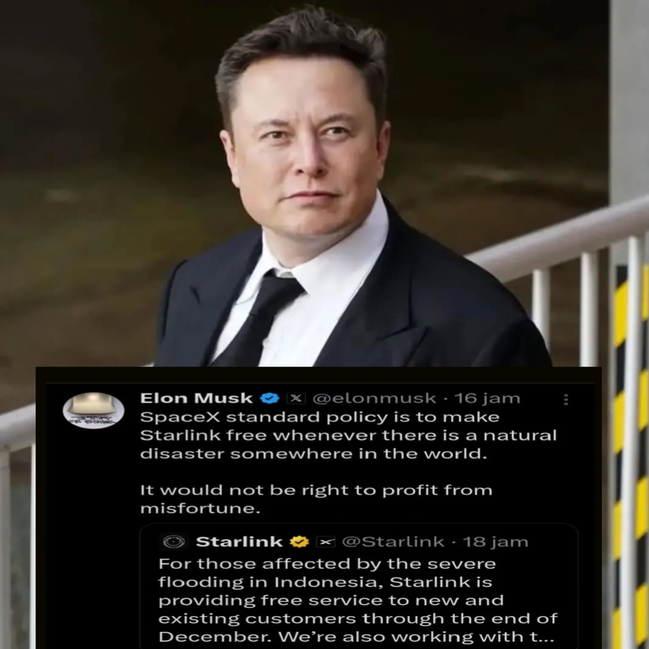 “Kebijakan standar SpaceX adalah menjadikan Starlink gratis setiap kali ada bencana alam di dunia. Tidak benar mengambil keuntungan dari kesusahan orang lain,” ujar Musk.