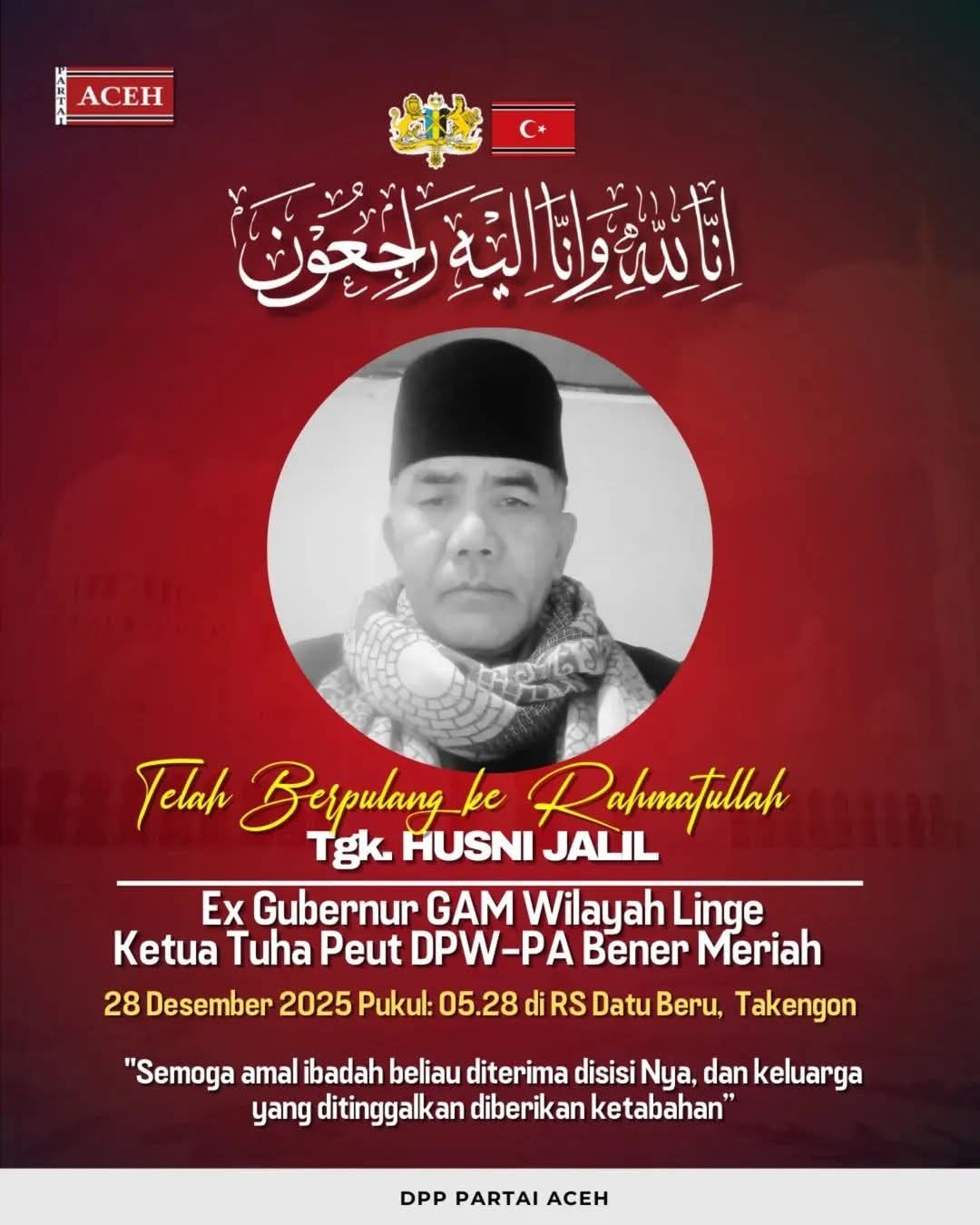 REDELONG, FR — Innalillahi wa inna ilaihi raji’un. Kabar duka menyelimuti masyarakat Aceh, khususnya wilayah Linge dan Kabupaten Bener Meriah. Telah berpulang ke Rahmatullah Tgk. Husni Jalil, mantan Gubernur GAM Wilayah Linge, pada Ahad, 28 Desember 2025, sekitar pukul 05.00 WIB.