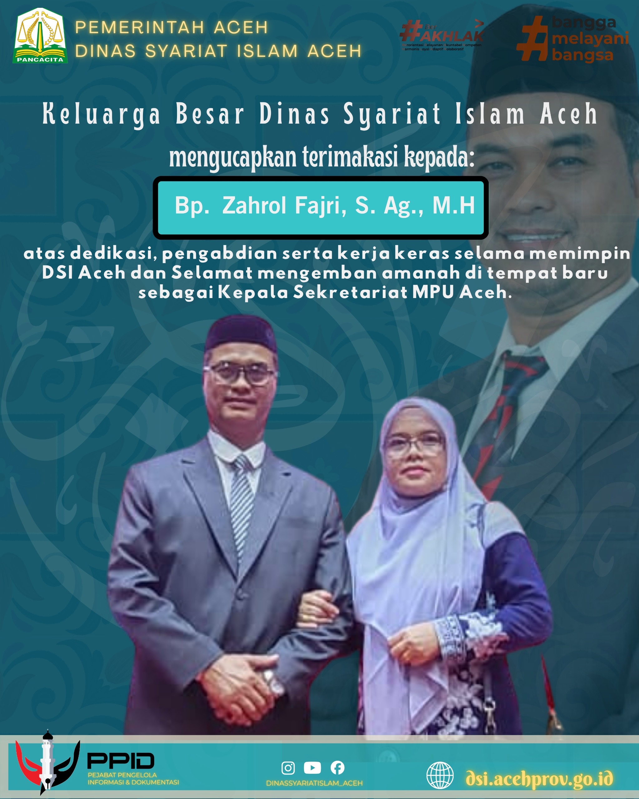 Keluarga besar Dinas Syariat Islam Aceh menyampaikan ucapan terima kasih dan penghargaan kepada Bp. Zahrol Fajri, S.Ag., M.H 2 Maret 20268 Maret 2026oleh Redaksioleh Redaksi Jangan LewatkanMualem Minta Otsus Abadi 2,5 Persen di Hadapan Banleg DPR RI pada Rapat Perubahan UUPAMualem Tegaskan JKA Tidak DihapusKala Kak Na Mengantar Janji Merawat Asa di Pedalaman Aceh UtaraPemerintah Aceh Sertakan Para Guru Besar Bahas Perubahan UUPABunda Guru Aceh Semangati Murid SD Negeri Tanah Rata